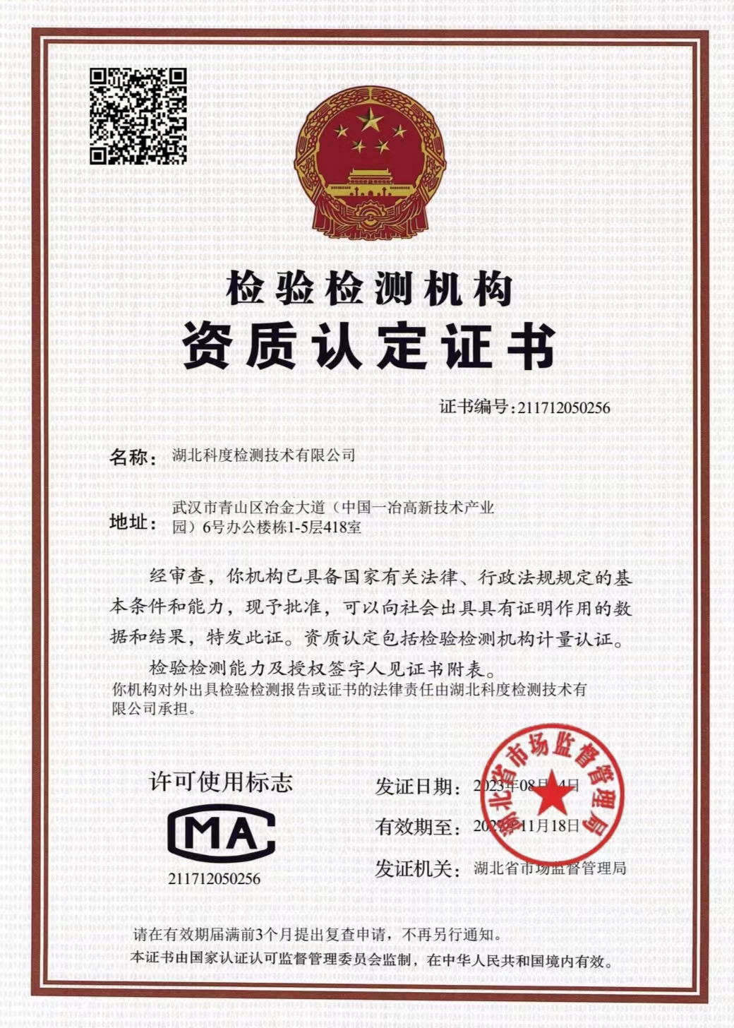 湖北科度檢測技術有限公司是一家專業從事環(huán)境類及相關領域檢測的第三方檢測機構,公司已通過湖北省市場監(jiān)督管理局CMA計量認證,可以面向社會出具權威CMA檢測報告。 我公司實驗室嚴格按照國家標準建設,擁有一大批國內外先進儀器設備及現代化配套設施,并有經驗豐富的中高級專業技術人員和嚴格的實驗室質量保證體系為項目運作提供強力支撐。 作為第三方檢測機構,公司始終以高度的社會責任感經營企業,以“公正、嚴謹、高效”為宗旨,依托專業的技術實力為客戶提供專業優(yōu)質檢測服務,受到政府、企業和社會各界的廣泛關注和認可。